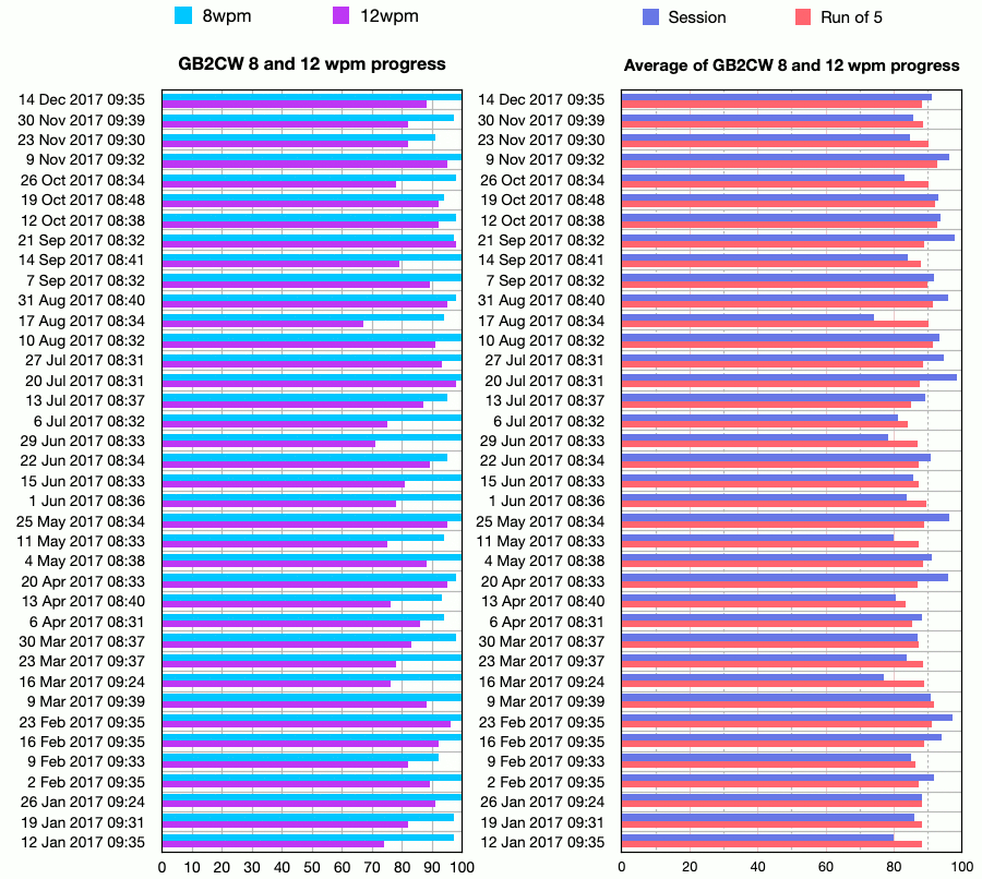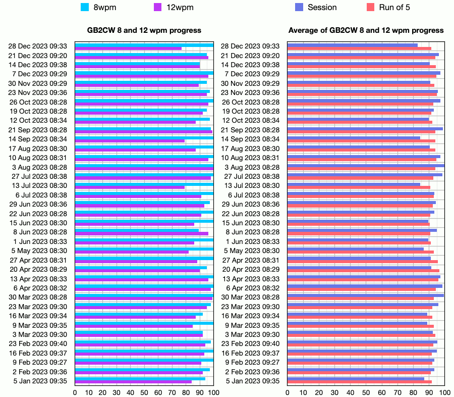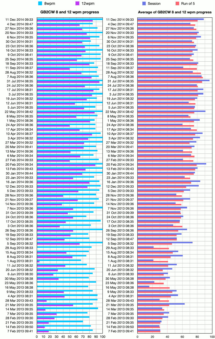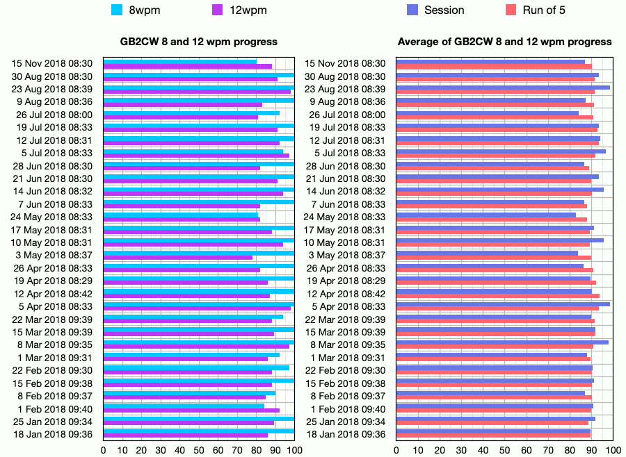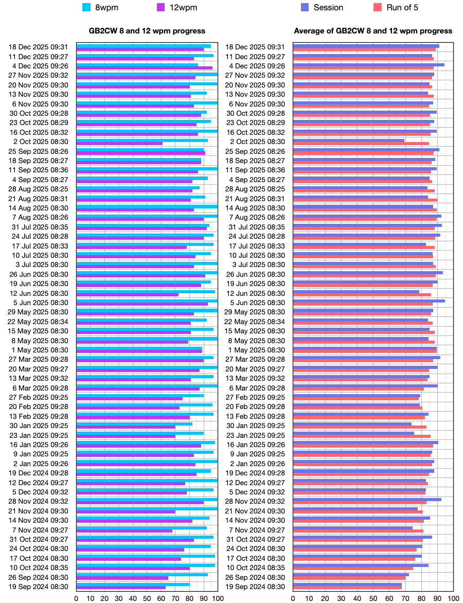 There's some evidence of improvement in the upward trend of the upper graph, but some of that is probably just down to my getting better at guessing which Q-code or abbreviation has just been sent rather than my getting better at recognising the characters. The lower (callsigns) graph probably better indicates my progress (or lack of it).