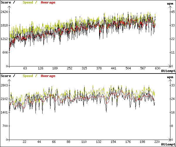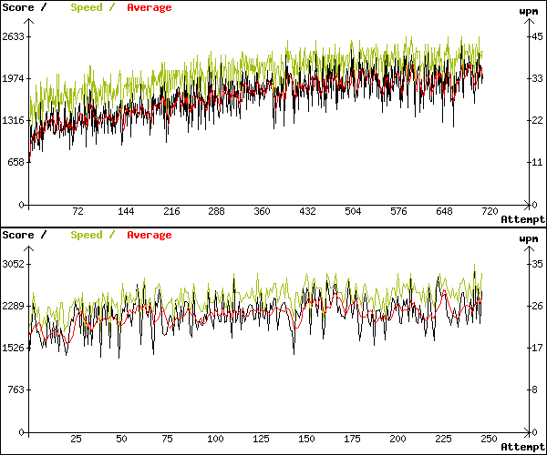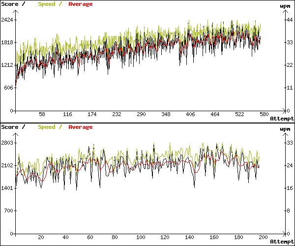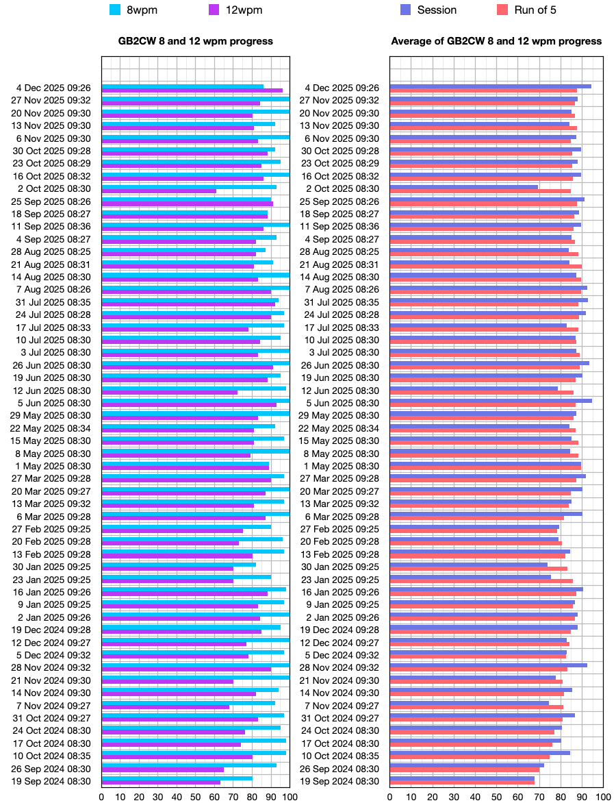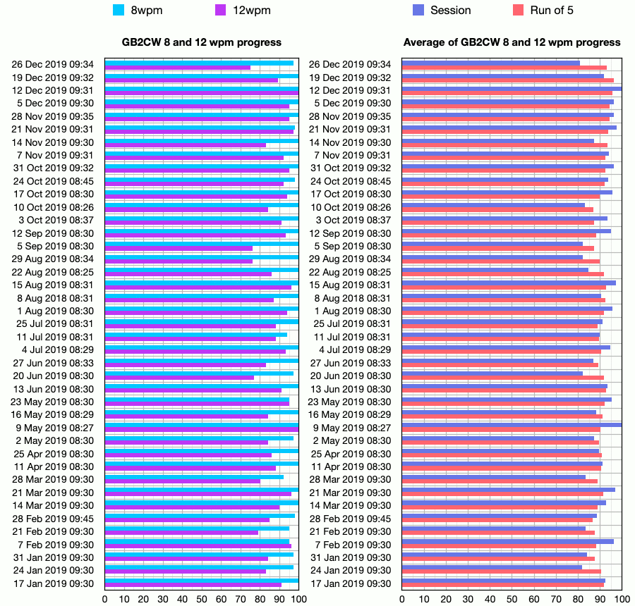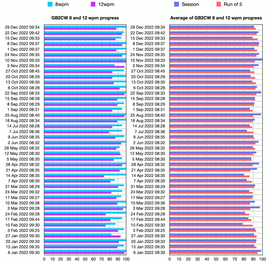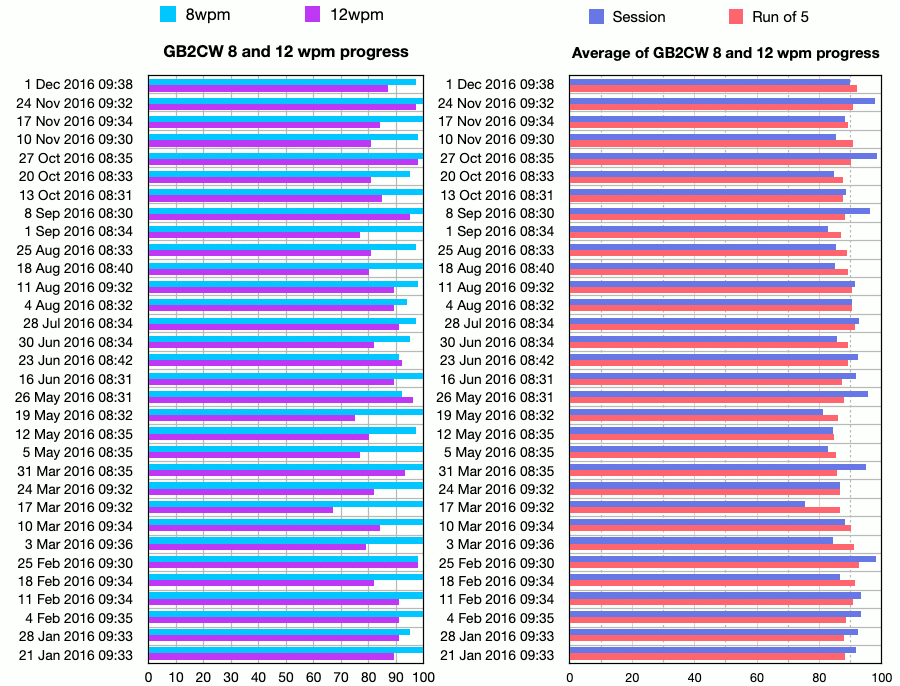 There's some evidence of improvement in the upward trend of the upper graph, but some of that is probably just down to my getting better at guessing which Q-code or abbreviation has just been sent rather than my getting better at recognising the characters. The lower (callsigns) graph probably better indicates my progress (or lack of it).
