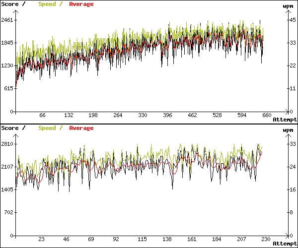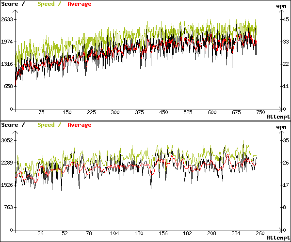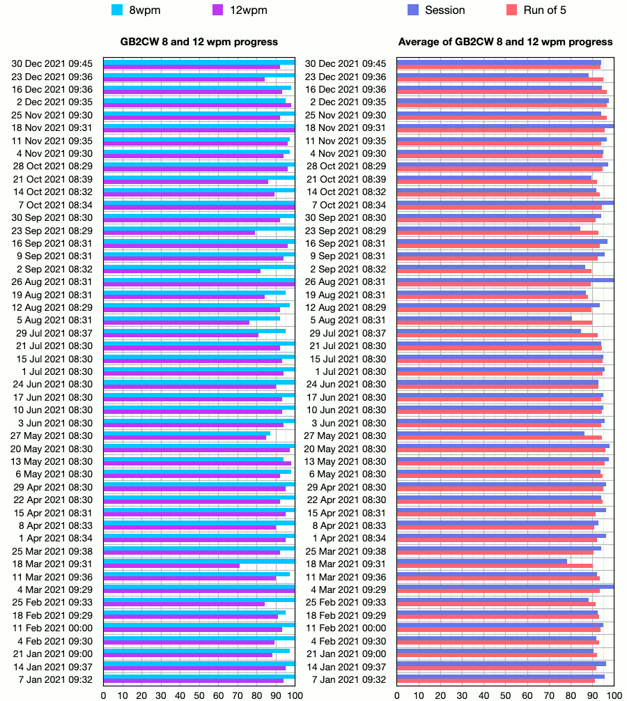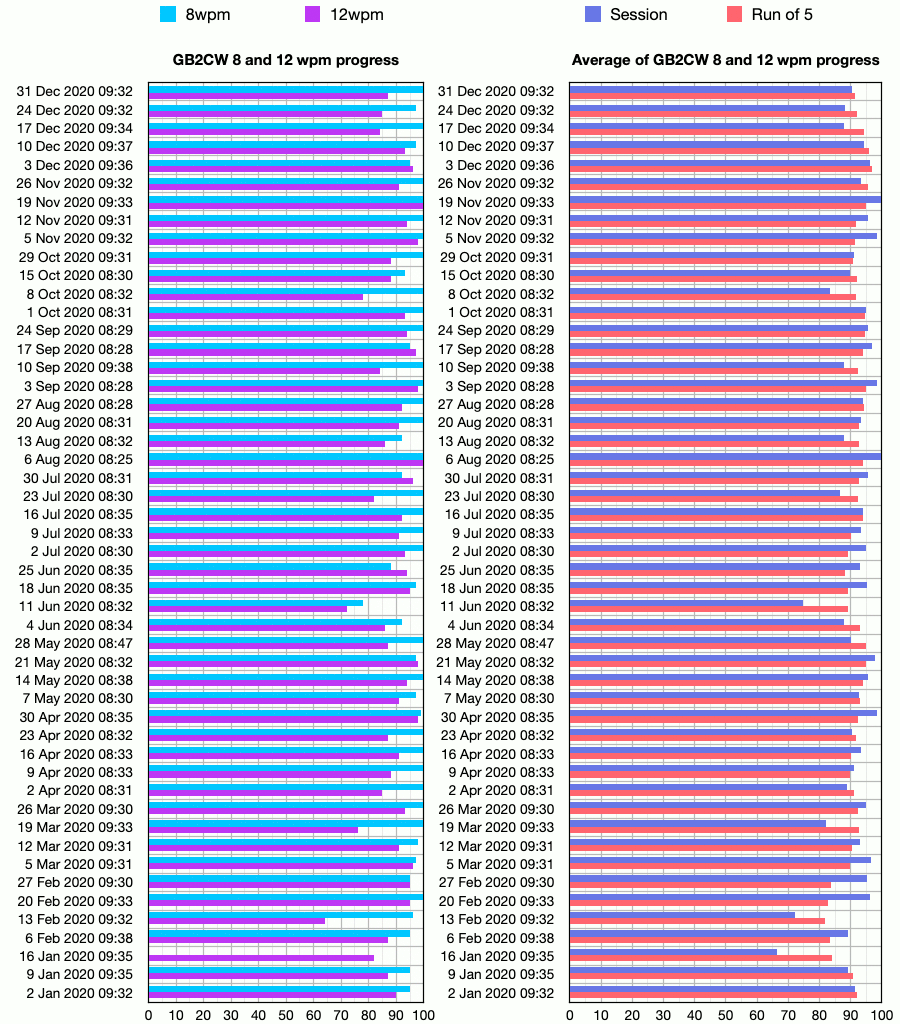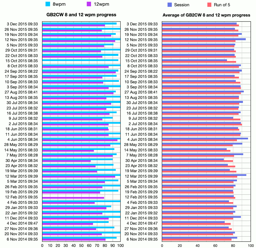 There's some evidence of improvement in the upward trend of the upper graph, but some of that is probably just down to my getting better at guessing which Q-code or abbreviation has just been sent rather than my getting better at recognising the characters. The lower (callsigns) graph probably better indicates my progress (or lack of it).